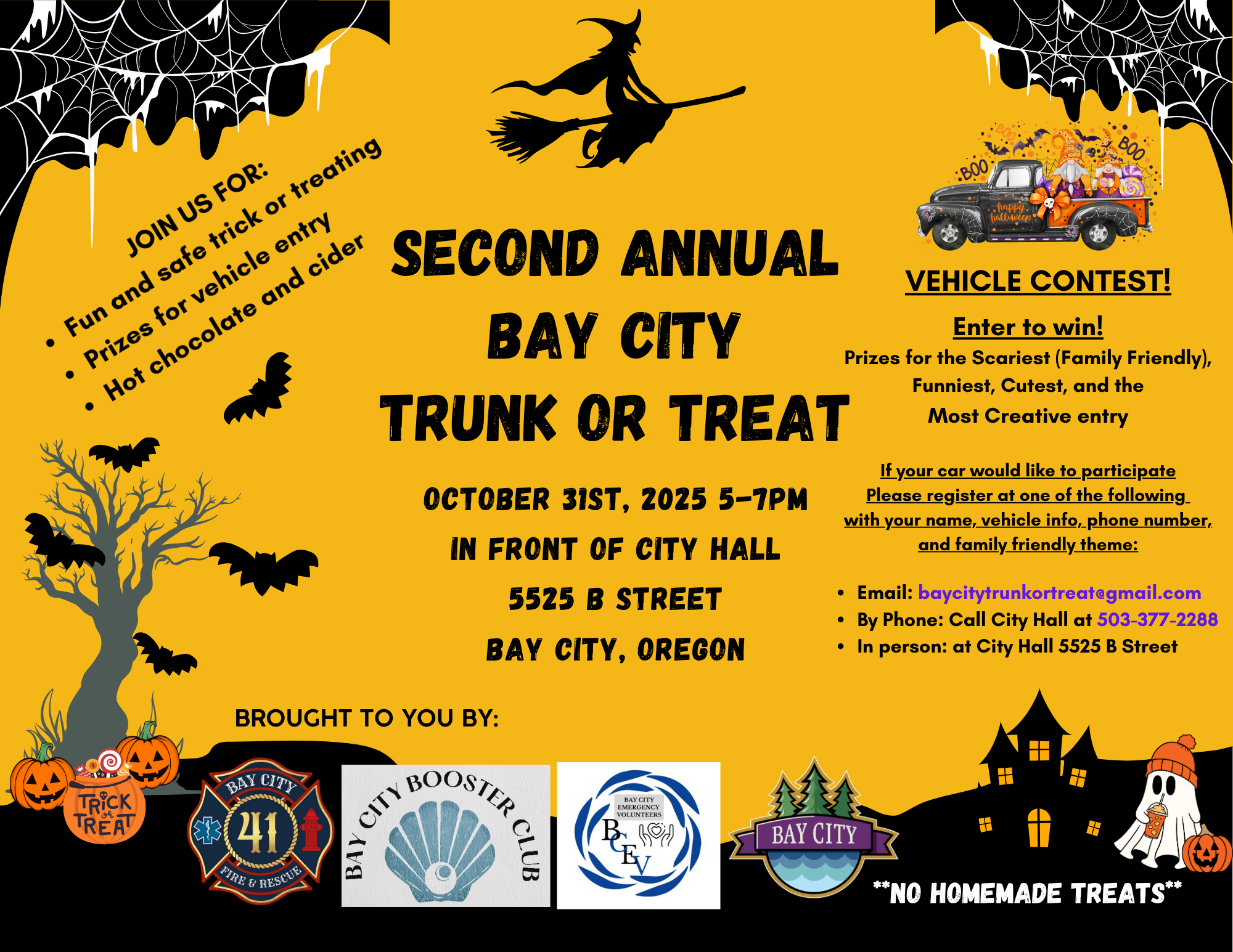 If you would like to participate by hosting a vehicle or a table inside City Hall, please reach out to baycitytrunkortreat@gmail.com, or call Town Hall at 503-377-2288. Indoor space is limited, so register early. Prizes given for Scariest, Funniest, Cutest and Most Creative!