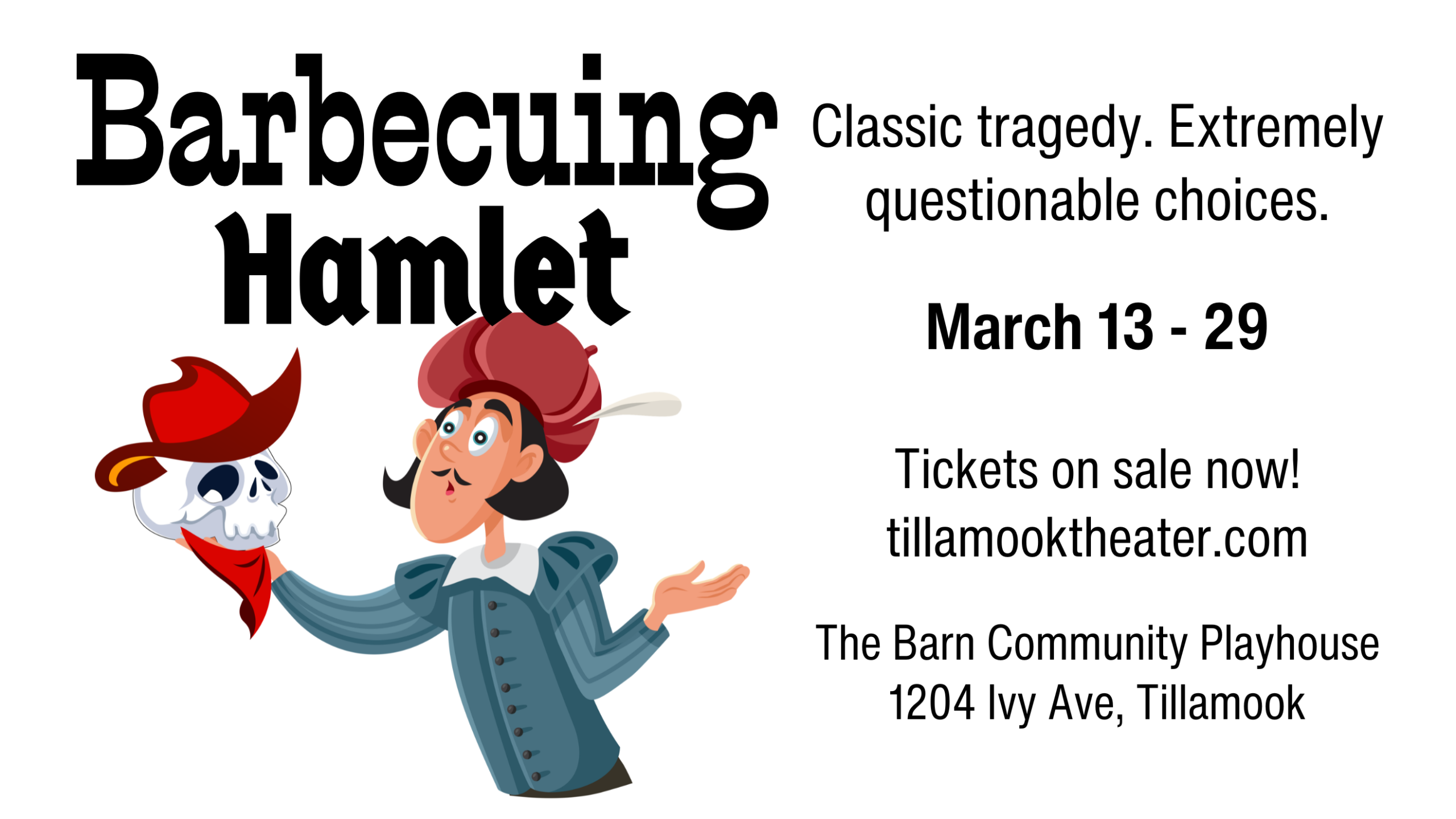 Barbecuing Hamlet opens March 13 and runs through March 29. Friday and Saturday shows start at 7:00 pm, Sunday shows start at 2:00 pm. Tickets are available at: https://tillamooktheater.ludus.com/index.php?sections=events
