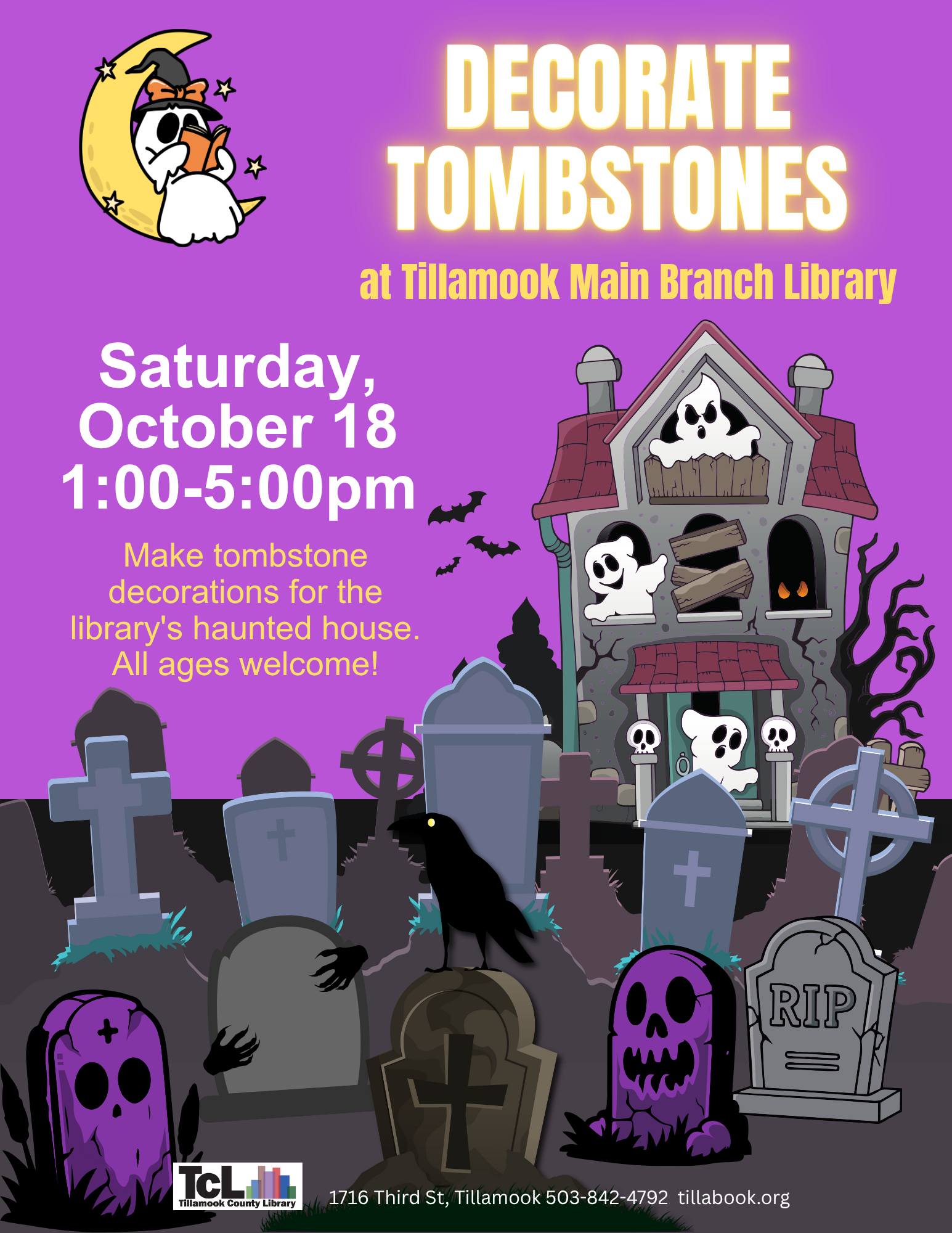 It’s almost time for the library’s haunted house (part of downtown trick or treat on Halloween!) and we need your help! All ages are invited to decorate tombstones to go along the haunted house path on Saturday the 18th, 1 pm!