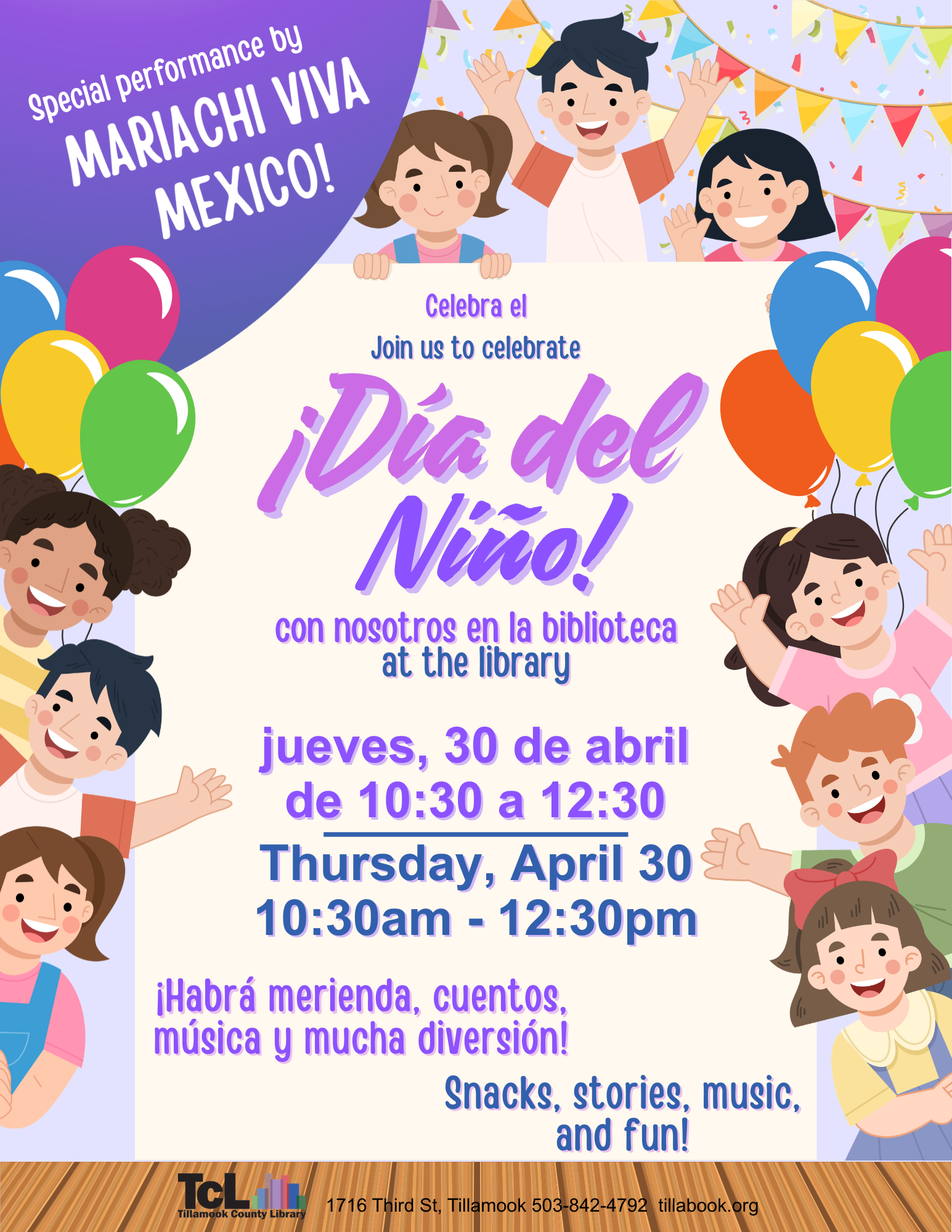 Join us to celebrate Dia del Niño at the main library branch! We’ll have snacks, stories, and a performance by Mariachi Viva Mexico!