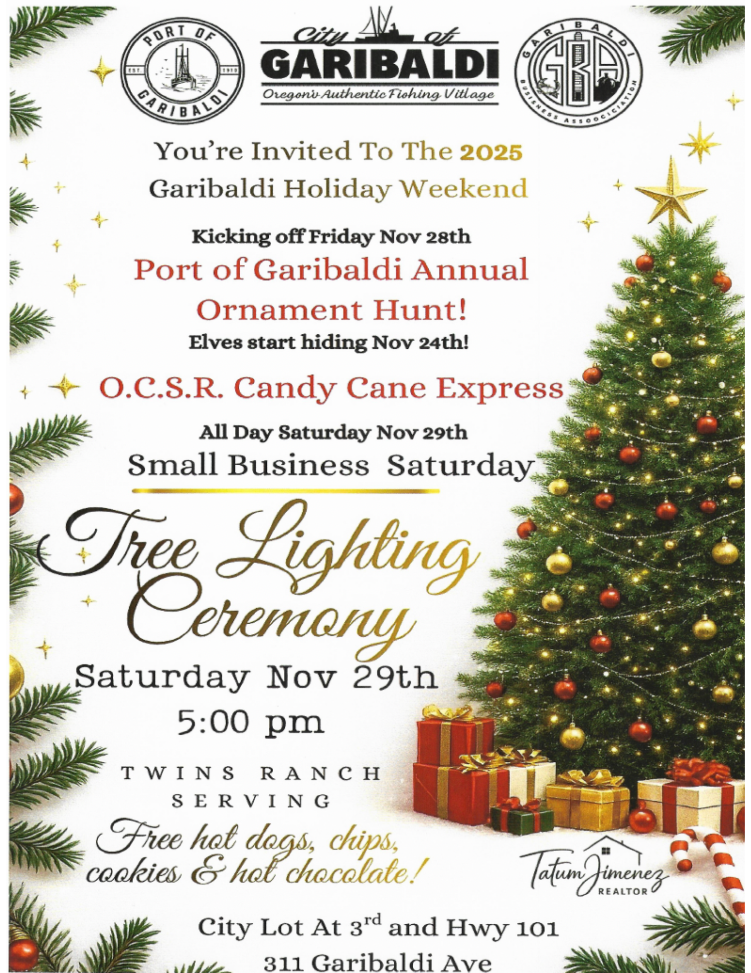 November 29th: OSCR Cady Cane Express all day and Small Business Saturday! Tree lighting at 5 at the City Lot at 3rd and Highway 101 – 311 Garibaldi Ave