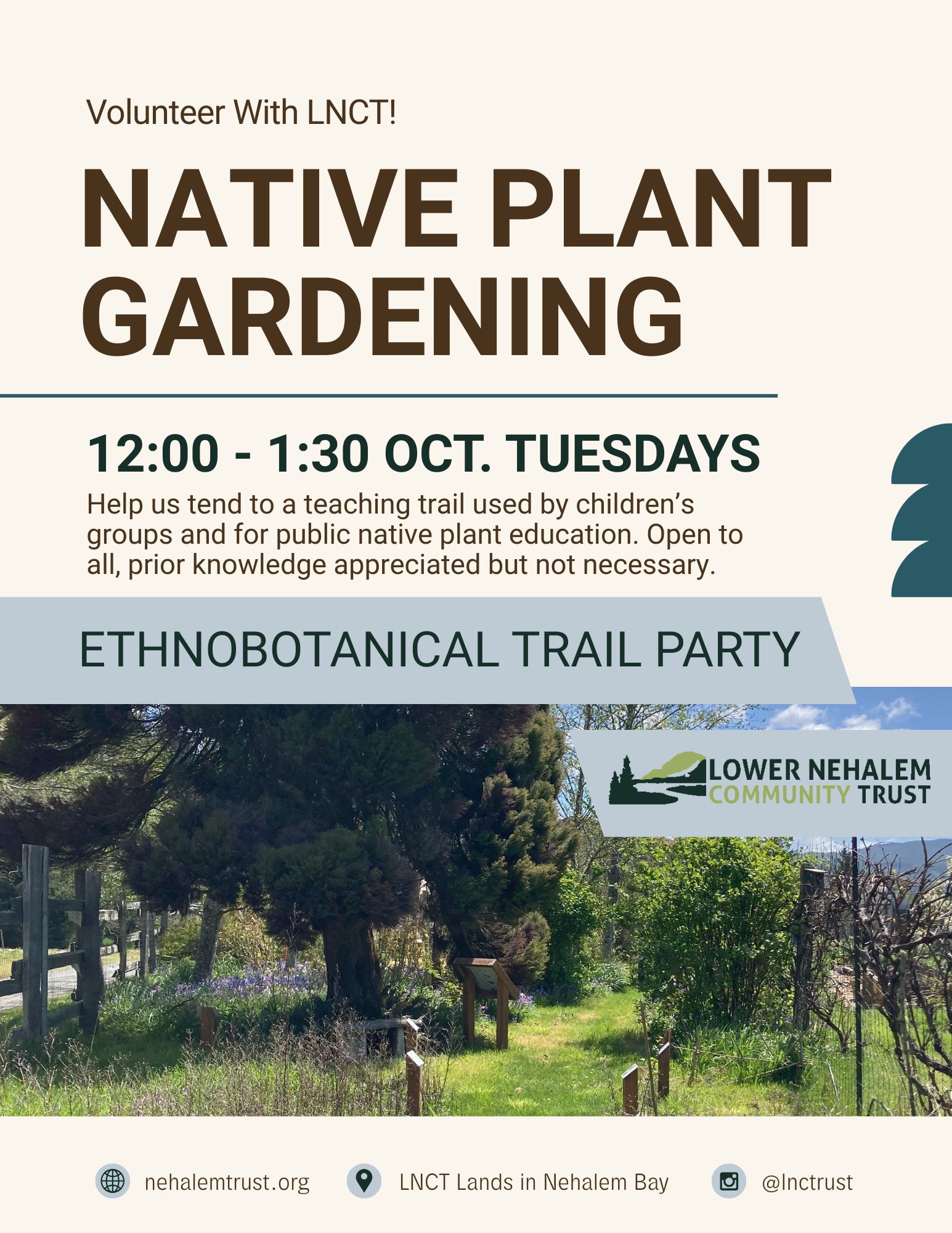 Alder Creek Farm’s Nehalem Teaching Trail is in need of a few helping hands. In October, we will meet every Tuesday at noon to tend to native plants—we welcome those with extensive knowledge and those seeking to learn about supporting local ecosystems through native plant gardening and landscaping.