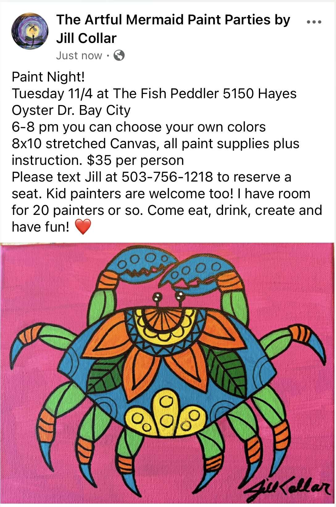 Paint Night!! The Artful Mermaid Paint Parties with Jill Collar!! 8×10 canvas, choose your own colors, kids welcome, 6-8PM,$35. RSVP Jill Collar 503-756-1218.