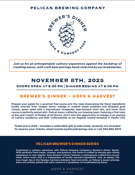 Don’t wait, get your tickets for Pelican Brewing’s upcoming Brewer’s Dinner: Hops & Harvest on November 8th at Pelican’s Pacific City brewpub. You won’t want to miss out on a special night filled with creative dishes from our innovative chefs and featured tastings from our world-class brewers. This five-course, beer paired dinner will take you on an unforgettable culinary journey.