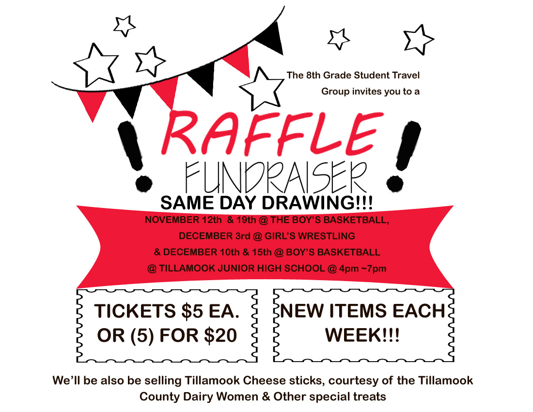 The Tillamook Junior High 8th grade travel group is hosting a “Raffle Table” at the next 5 home boy’s basketball games and girl’s wrestling meet. They will have two different items available to win each week. Same day drawing. Tickets are 1 for $5.00 or (5) for $20.00. They will also be selling various special treats.
