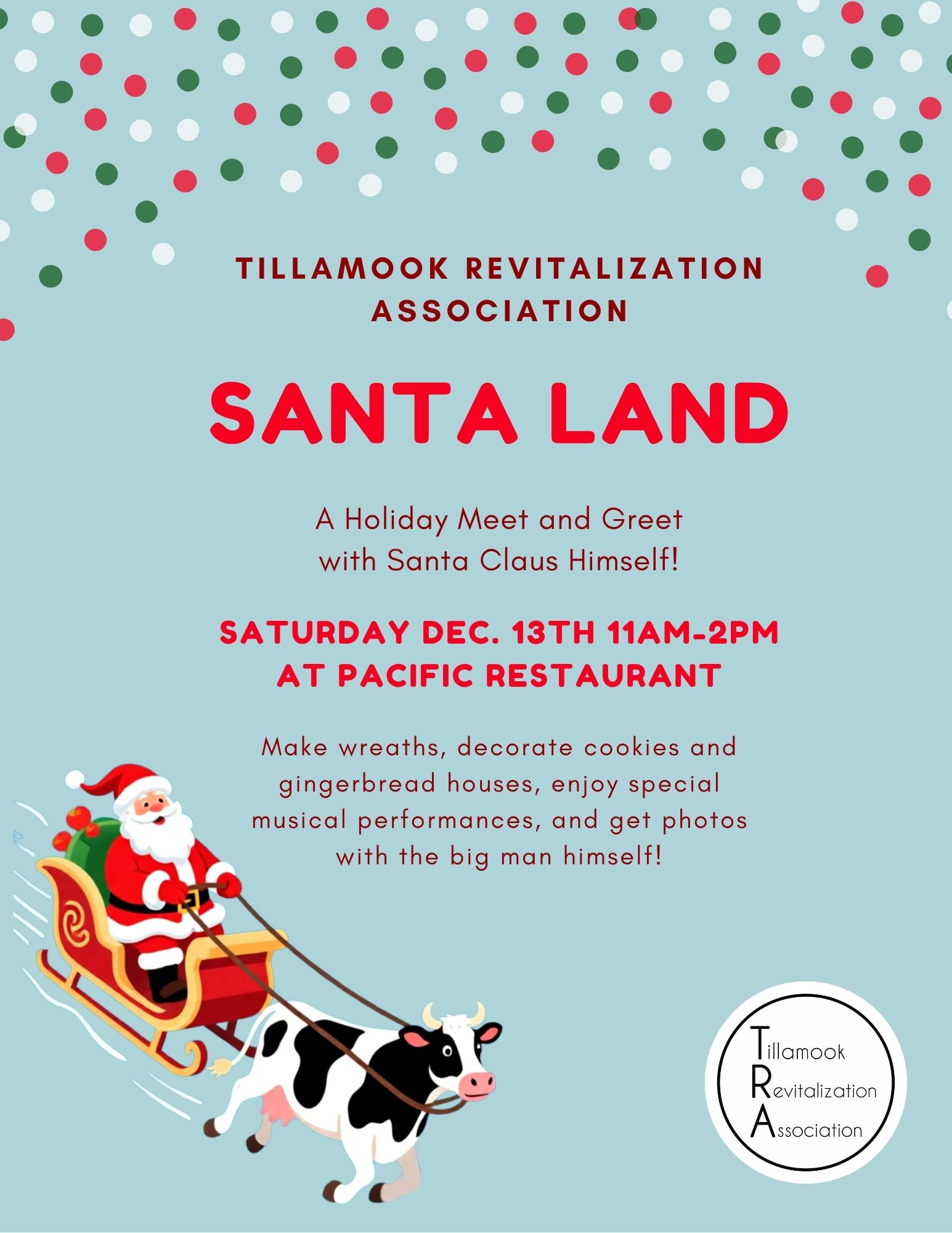 Tillamook Revitalization Association is sponsoring 5th annual Santaland at Pacific Restaurant. Event is open to all Tillamook Residents and is free.