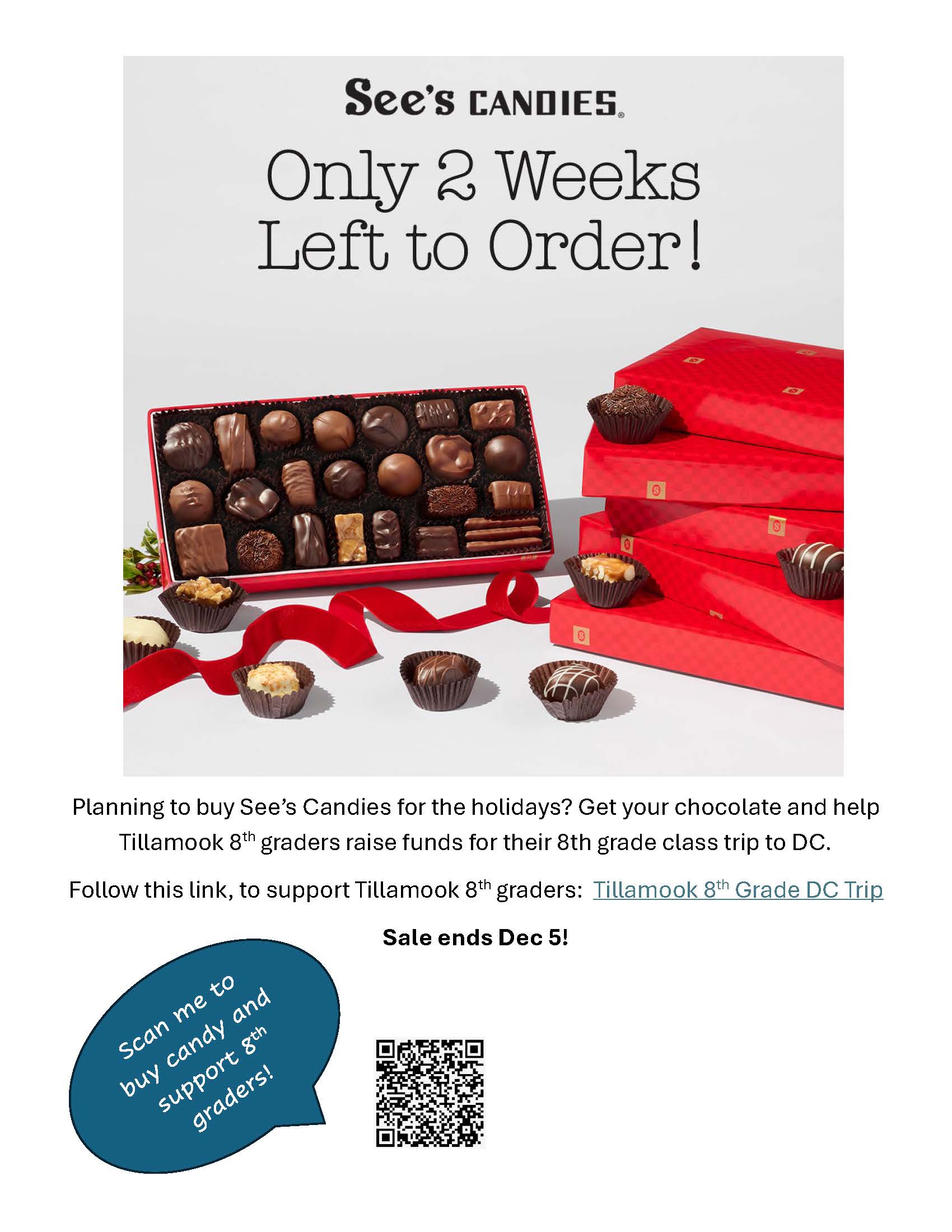 Planning to buy See’s Candies for the holidays? Get your chocolate and help Tillamook 8th graders raise funds for their 8th grade class trip to Washington DC.