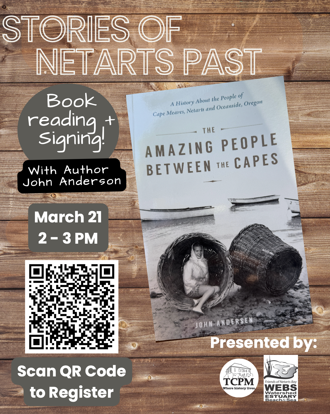 Join Friends of Netarts Bay WEBS and the Tillamook County Pioneer Museum for a special presentation celebrating the people and history of the Oregon Coast with local author and historian John Andersen. John will share stories from his newly released book, The Amazing People Between the Capes – A History about the People of Cape Meares, Netarts, and Oceanside, Oregon, and foster a greater knowledge of the area’s diverse history.
