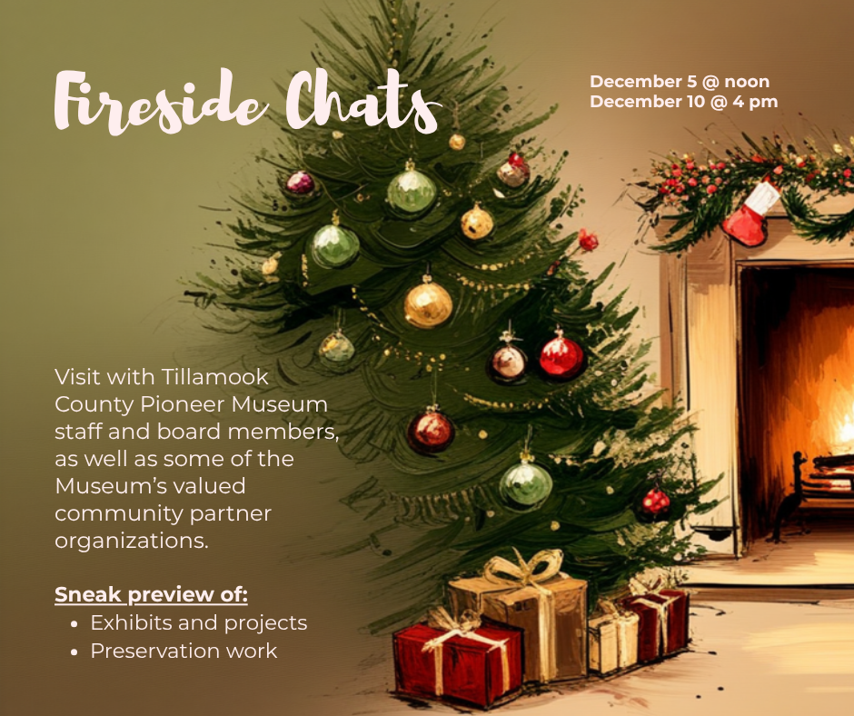 Guests are invited to visit with Tillamook County Pioneer Museum staff and board members, as well as some of the Museum’s valued community partner organizations. During this time, visitors can get a sneak preview of upcoming exhibits and projects, as well as learn more about the important work the Museum does to preserve and interpret Tillamook County’s cultural and natural heritage. The first Fireside Chat will take place, Friday, December 5 at noon. A second Fireside Chat will be hosted on Wednesday, December 10 at 4 pm. Fireside Chats are free and open to the public.