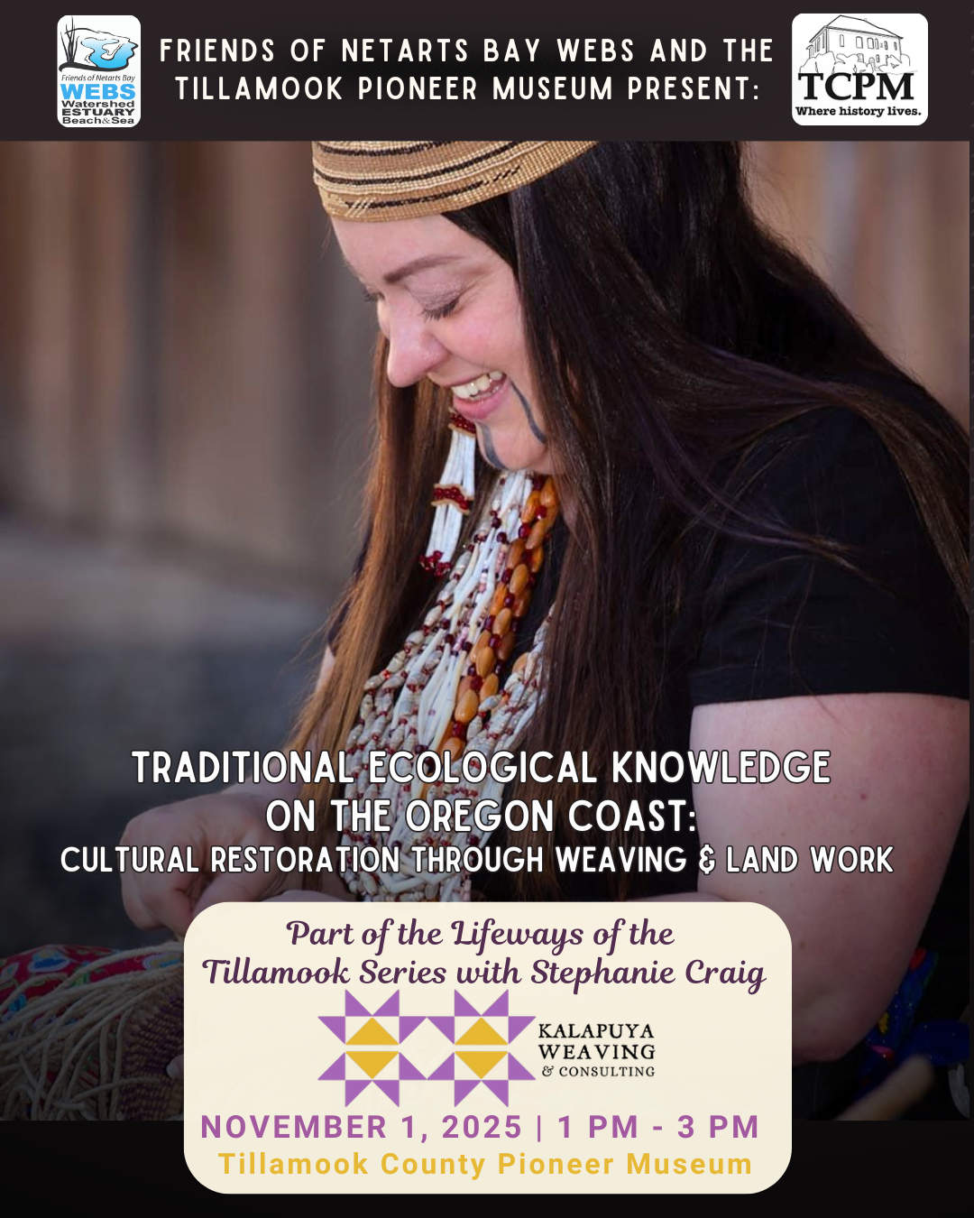 Saturday, November 1st, Friends of Netarts Bay WEBS is honored to host Stephanie Craig, cultural practitioner and tradition-keeper, basket weaver, consultant, educator, and founder of Kalapuya Weaving and Consulting and Rooted Way.