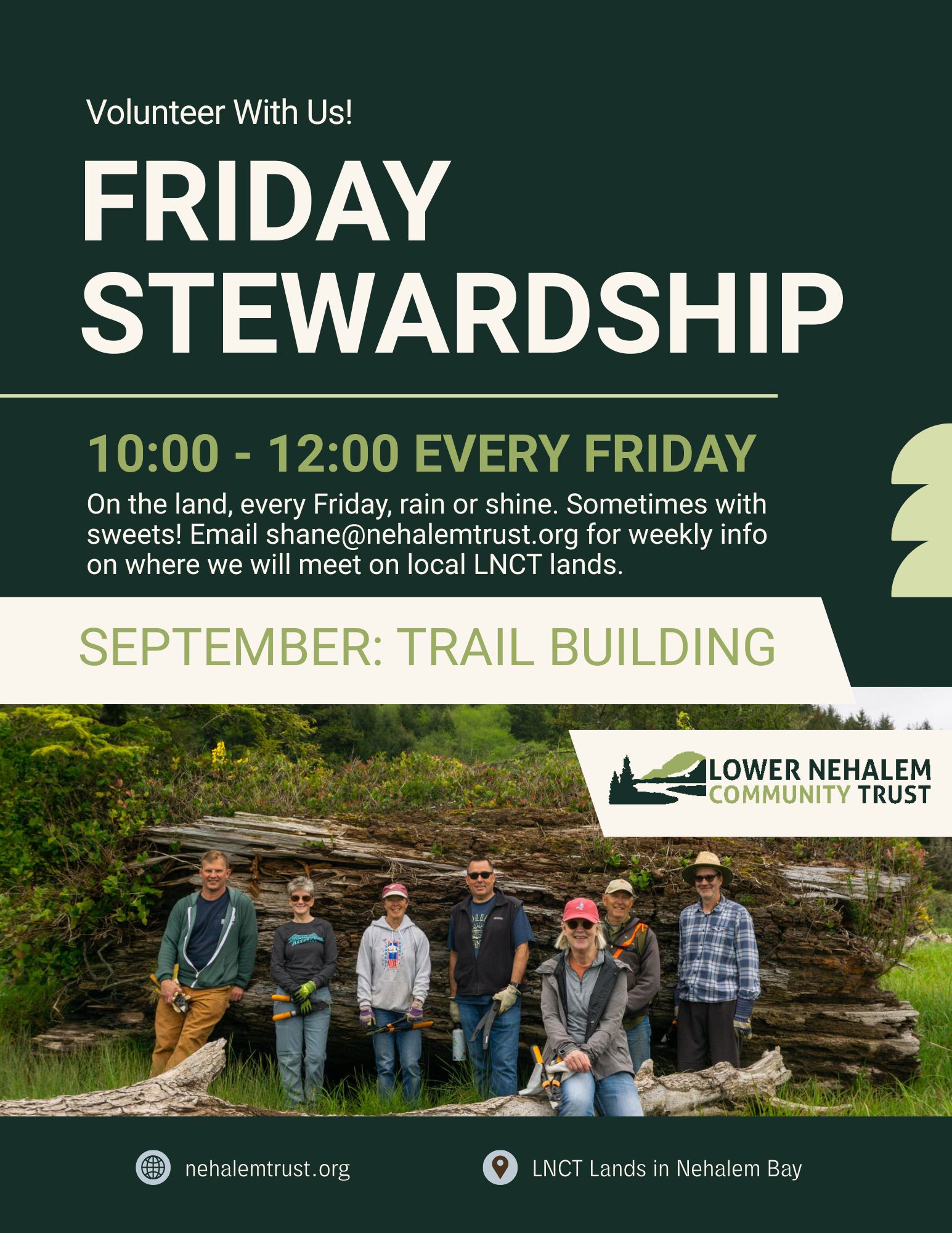 Tools and gloves are provided, new volunteers welcome and no prior experience needed. Join as frequently as you please.  Email shane@nehalemtrust.org for weekly updates on where to meet.