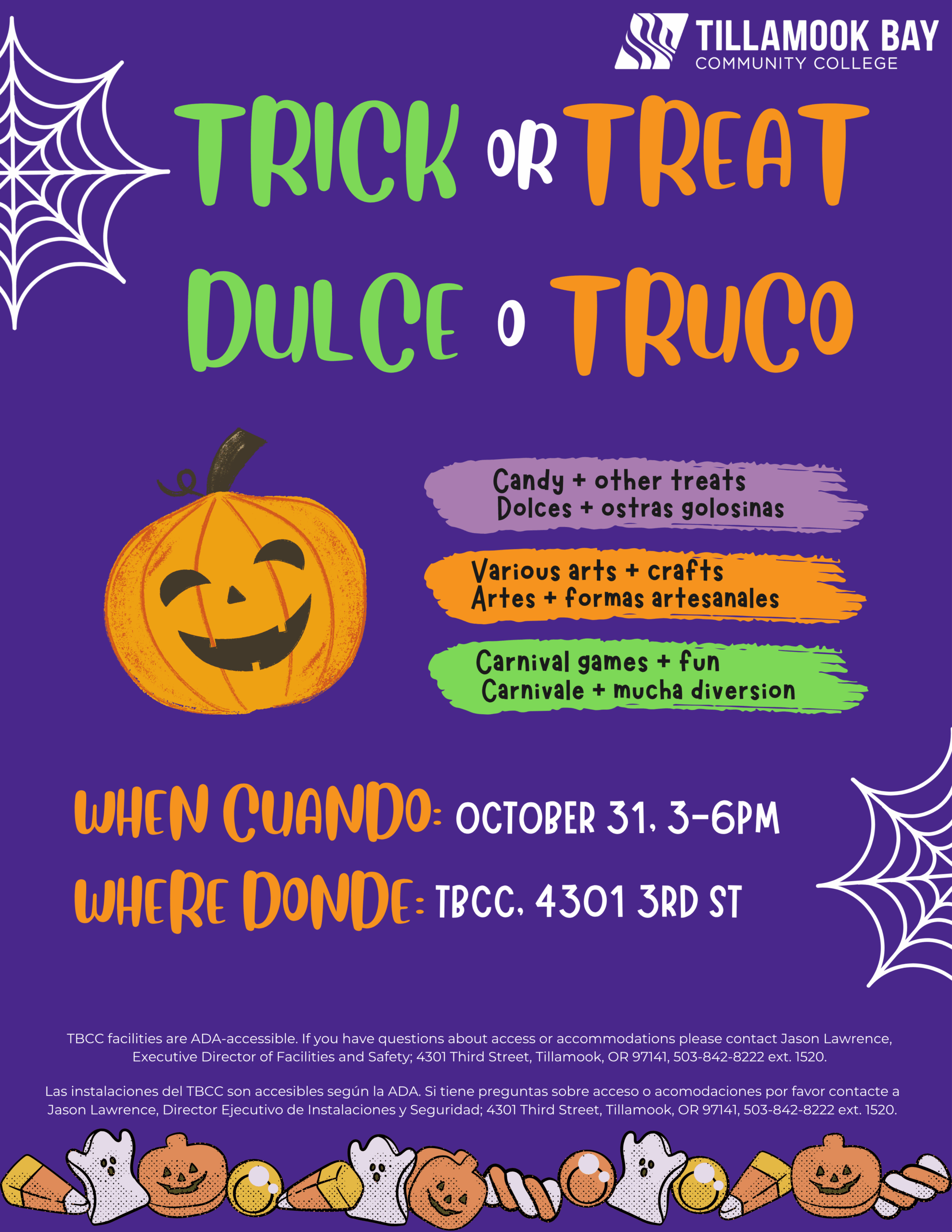 Stop by Tillamook Bay Community College on Halloween from 3:00 – 6:00 PM for fun activities, great costumes, candy (of course), and a carnival! Bring the whole family and join us for a wonderful night full of fun and fright
