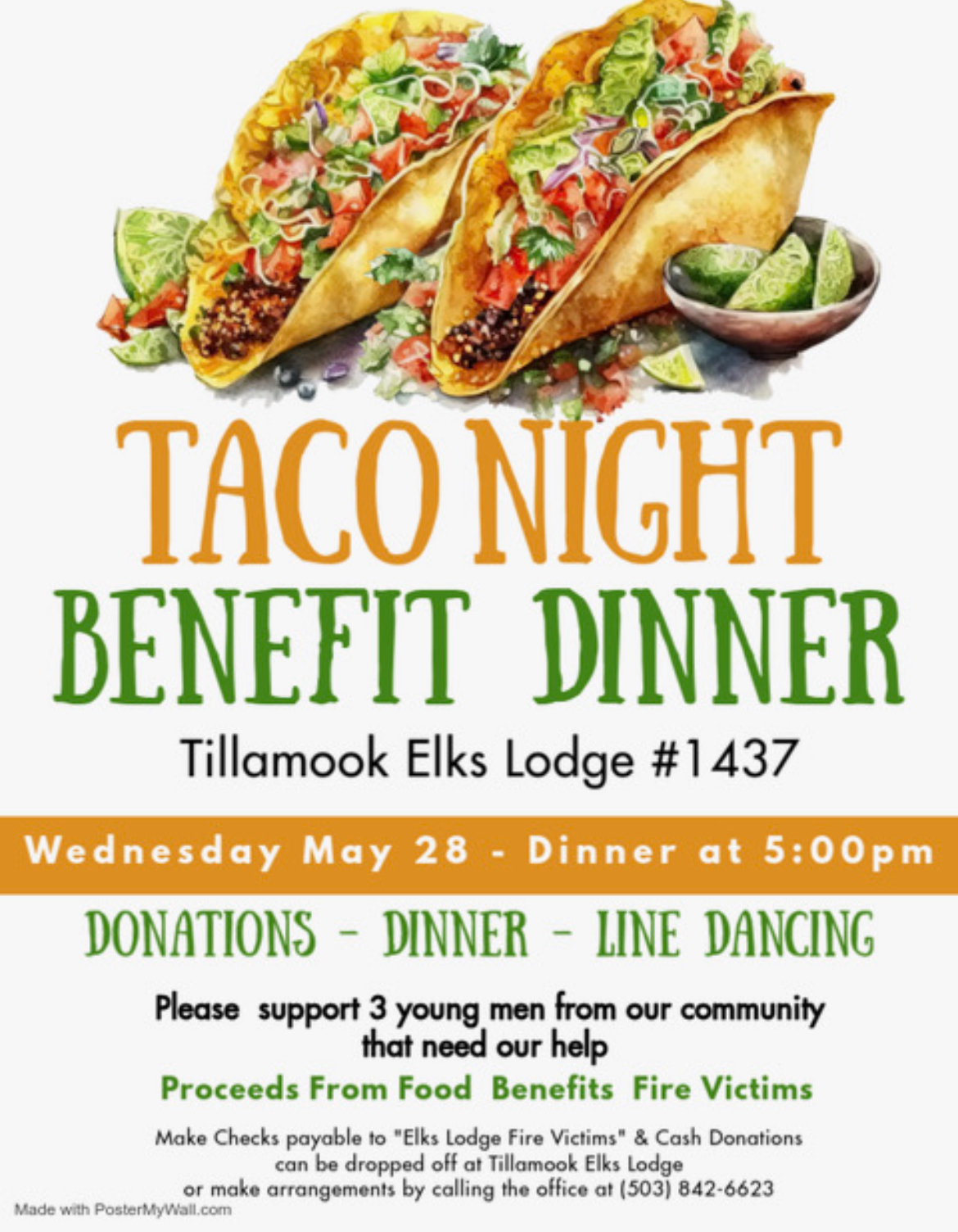 Tillamook Elks lodge is hosting a benefit dinner Wednesday May 28, 2025 starting at 5:00pm. This benefit dinner is to support 3 young men that lost their house due to a fire. We need the community to come out and support these young men and give them a fresh new start. Dinner - Donations - …